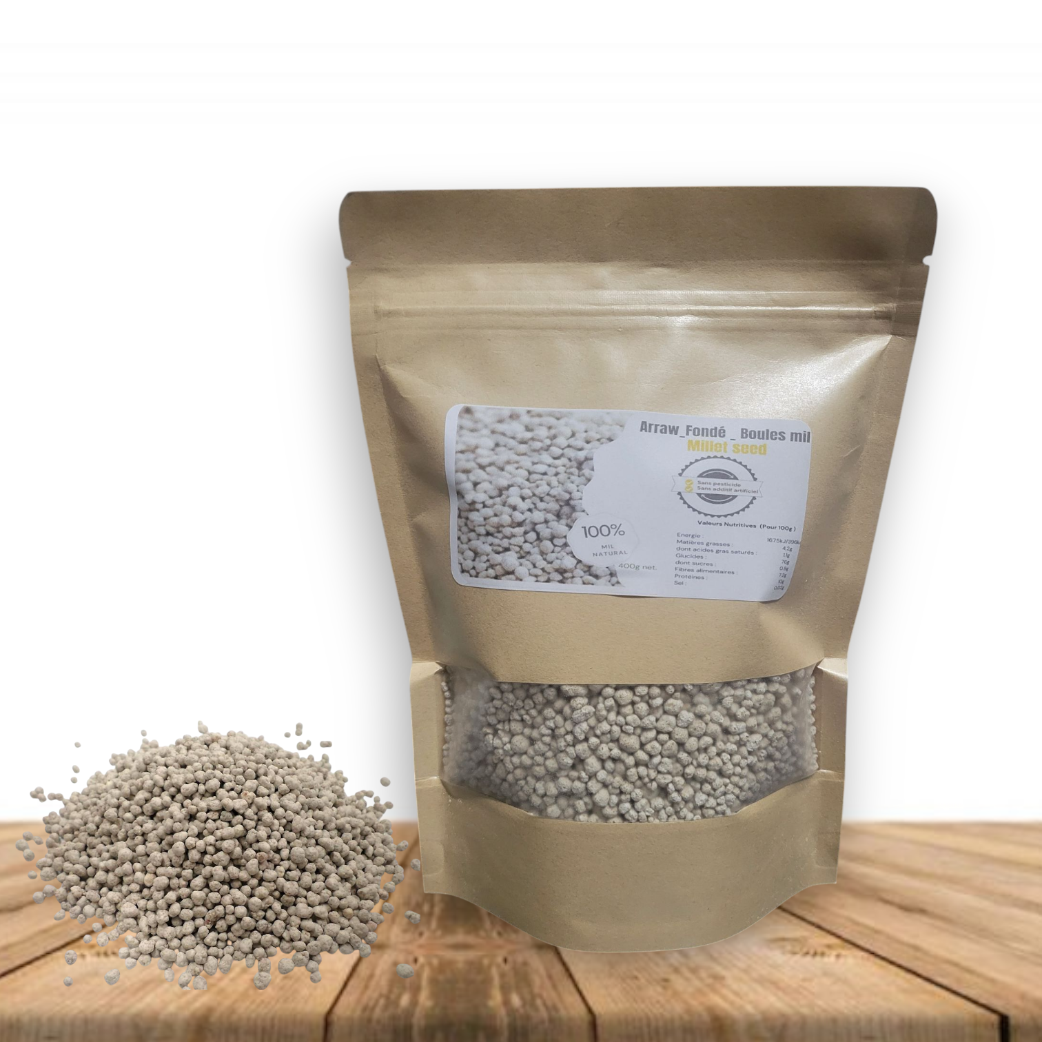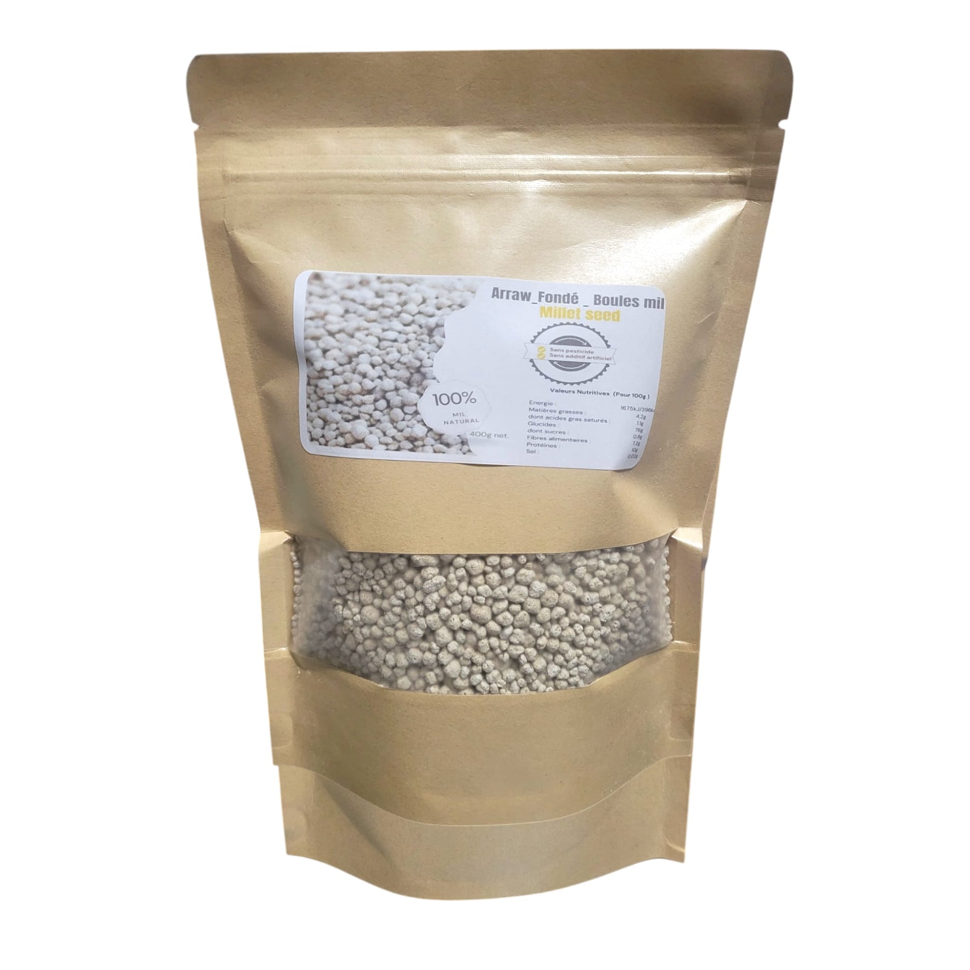 Ce produit est fabriqué artisanalement en roulant la farine de mil pour obtenir des micro-granulés. Naturellement sans gluten et riche en fibres, il constitue une alternative nutritive idéale pour divers plats.